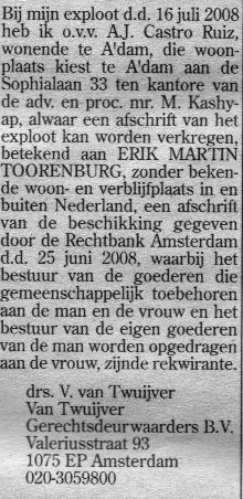 Mevrouw Van Toorenburg ofwel Aura Jazmin Castro Ruiz mag namelijk van de rechtbank de zaakjes van haar man gaan beheren.Is dat even handig, want dan is dat beslag dat ze op het bezit van haar man had laten leggen in juni 2007 helemaal niet meer nodig! Misschien wil ze voor de echtscheiding ook nog even een deel van de buit binnenhalen. Voor zichzelf of voor… wie zal het zeggen? Bijkomend effect is dat het misschien wel een beetje druk zal gaan worden bij haar aan de deur, want ze is zeker niet de enige aan wie Erik nog wat schuldig was.