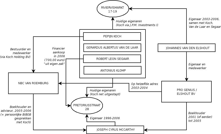 8. Pepijn Koch en Segaar spelen in deze samenhang een bijzondere rol. Vanaf ... was McCarthy klant van Kochs accountkantoor NBC Roemburg en Partners. In ... zetelde NBC Roemburg op het zelfde Haarlemse adres dan Jan van den Elshouts administratiekantoor Pro Genius, namelijk op de van Nesstraat 78. Nog voor de uiteindelijk aankoop van de Pretoriusstraat 28 heeft Koch aantoonbaar McCarthy meerdere keren geadviseerd, met name over hoe met claims van de UWV en het toen al lopende BIBOB onderzoek om te gaan. Het is wederom zeer waarschijnlijk dat Koch van de oorsprong van McCarthys inkomsten op de hoogte was en uiteindelijk ook afspraken heeft gemaakt over de onderhandse aankoop van de Pretoriusstraat 28. In genoemde samenhang vallen er vraagtekens te plaatsen bij de herkomst van het geld van de door Segaar aan zijn medeeigenaars verleende hypotheek voor het pand. Het gaat immersover een garantstelling van 700.000 euro (rond 200% van de aankoopsom en 250% van de getaxeerde waarde) die Segaar dan uit 'eigen vermogen' moet hebben gefinancierd. Gezien de hoogte van de som en McCarthys situatie is het best mogelijk dat het daarbij om doorlopende inkomsten uit McCarthys activiteiten gaat. De hypotheek waarborgt dan de behartiging van de belangen van de echte eigenaar van dit vermogen tegenover de andere medeeigenaren.
